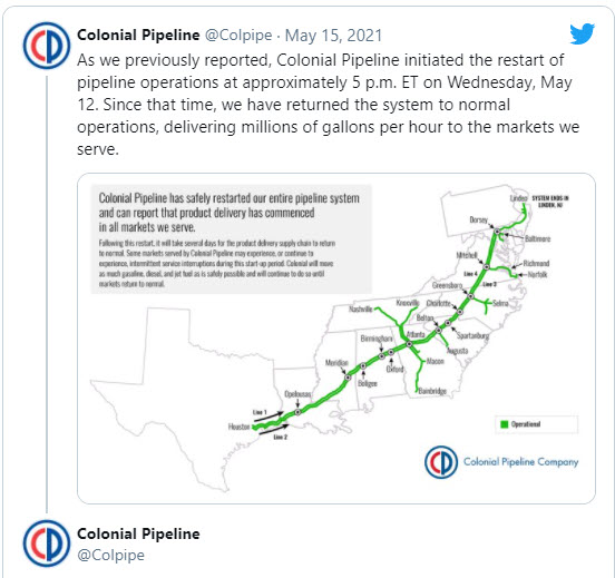 According to the company’s official Twitter account, Colonial Pipeline has resumed normal operations after following the devastating ransomware attack that shutdown of the largest fuel pipeline in the U.S. The flow of fuel had been improving by Saturday, however, there were still many gas stations without enough fuel. The worst of the shortages took place on Thursday night. By Friday, Energy Secretary Jennifer Granholm told The Associated Press that the country was “over the hump” and things would start improving. “It’s still going to work its way through the system over the next few days, but we should be back to normal fairly soon,” she said. “The good news is that … gas station outages are down about 12% from the peak” as of Friday afternoon, with about 200 stations returning to service every hour, she said. “It’s still going to work its way through the system over the next few days, but we should be back to normal fairly soon.″